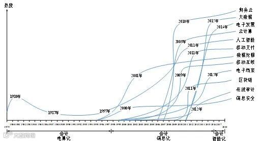 第四,实践维度的产品应用与知识维度的理论热点具有螺旋式关系。即部分会计信息化产品的应用会影响理论热点的产生,如2010年用友发布《用友云战略白皮书》,随后金蝶和浪潮、以及国外的MYOB也发布财务云产品,中国会计学会会计信息化年会从2013年开始将财务云作为理论热点;部分会计信息化理论热点也将会影响相关产品的应用,如人工智能从上个世纪80年代的专家系统开始,始终作为理论热点存在,而中国各家厂商推出各种智能财务方案,是从2016年德勤和Kira Systems宣布将人工智能引入会计、税务、审计等工作开始的。