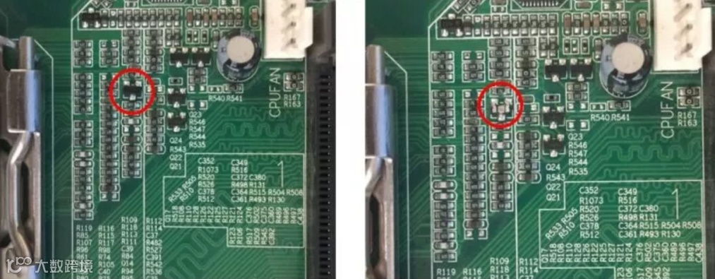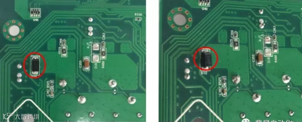 图左:电阻正常焊接状态,图右:电阻漏焊状态