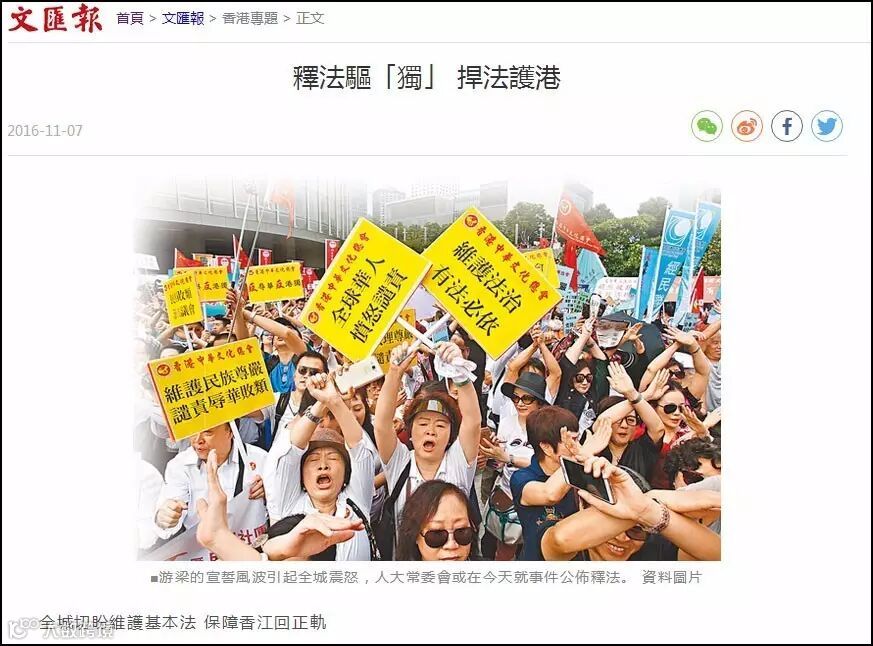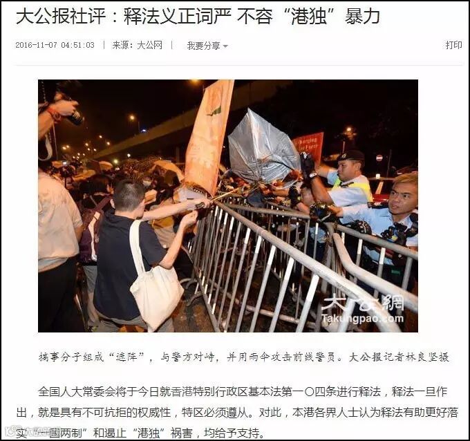 香港《大公报》的社评认为,个别议员辱华“誓词”风波已在全国范围内掀起“巨浪”,不少人都“摩拳擦掌”喊打、义愤填膺,全国人大常委会在此社会氛围和贯彻落实基本法的权责下,释法已是唯一出路,不释法无以对基本法、更无以对全国人民交代。