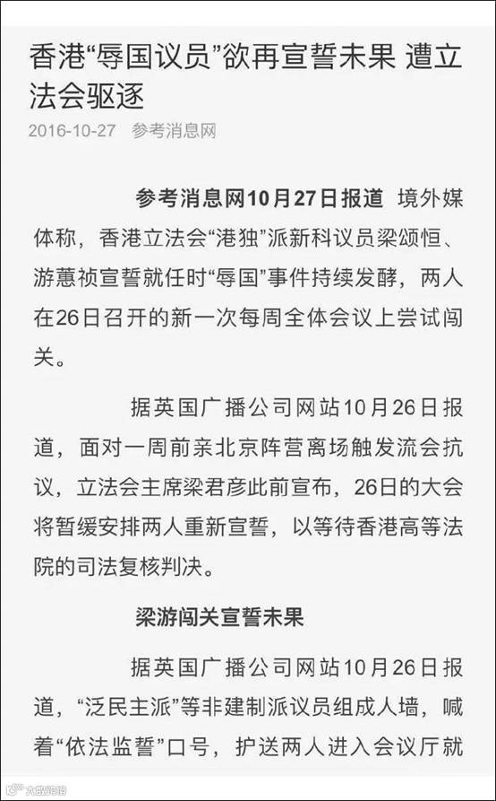 面对聚焦在“辱华议员”再宣誓问题上的不同意见间的激烈冲突,目前,香港立法会已对梁、游二人的强行闯关进行驱逐,并暂缓安排两人的重新宣誓,并等待香港高等法院裁决。