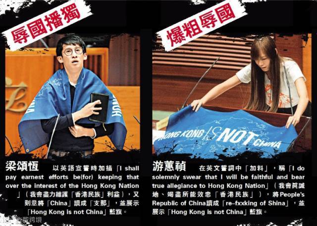 据香港媒体报道,这两位议员名叫梁颂恒、游蕙祯,此二人在宣誓仪式上当众展示写有“香港不是中国”的蓝色旗帜,并在宣誓时更改誓词内容,称效忠“香港民族”,并将英文誓词中的“China”故意读为具有辱华意味的“支那”。并用fxxking 等侮辱性词汇放在"China"之前。