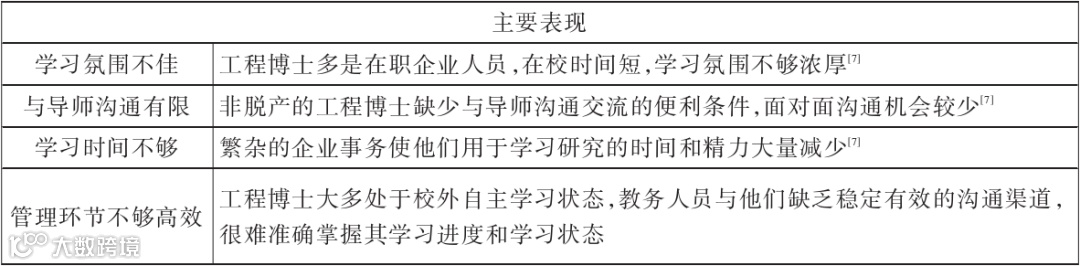 是否脱产学习是工程博士培养模式与工学博士的另一个明显差异。工学博士可以全时在校开展博士期间的学习和研究工作,将全部精力投入到学术研究当中。而工程博士多是非脱产式学习,开展学习研究工作存在一些短板,如表1所示。