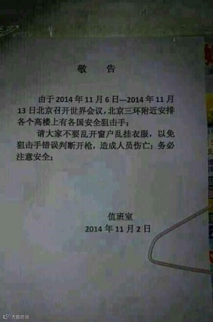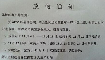 No.1 APEC期间接待洋大人的34个驻地饭店,采取管制就不说了,周围的餐饮、商店以及美容美发产业都被整顿,尤其是保健品不让卖了。当然,大保健也是不会有了。所以,若你们生活在34个饭店的周边,一句劝告:消停点儿。
