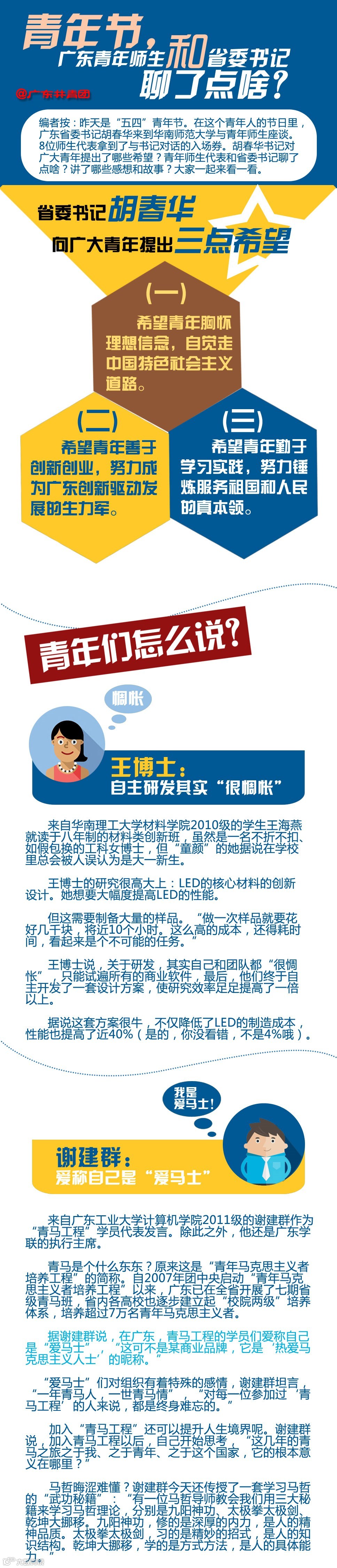 导读:昨天是“五四青年节,”在这个青年人的节日里,广东省委书记胡春华来到华南师范大学与青年师生座谈,大家一起来看看青年师生代表和省委书记的五四对话吧!