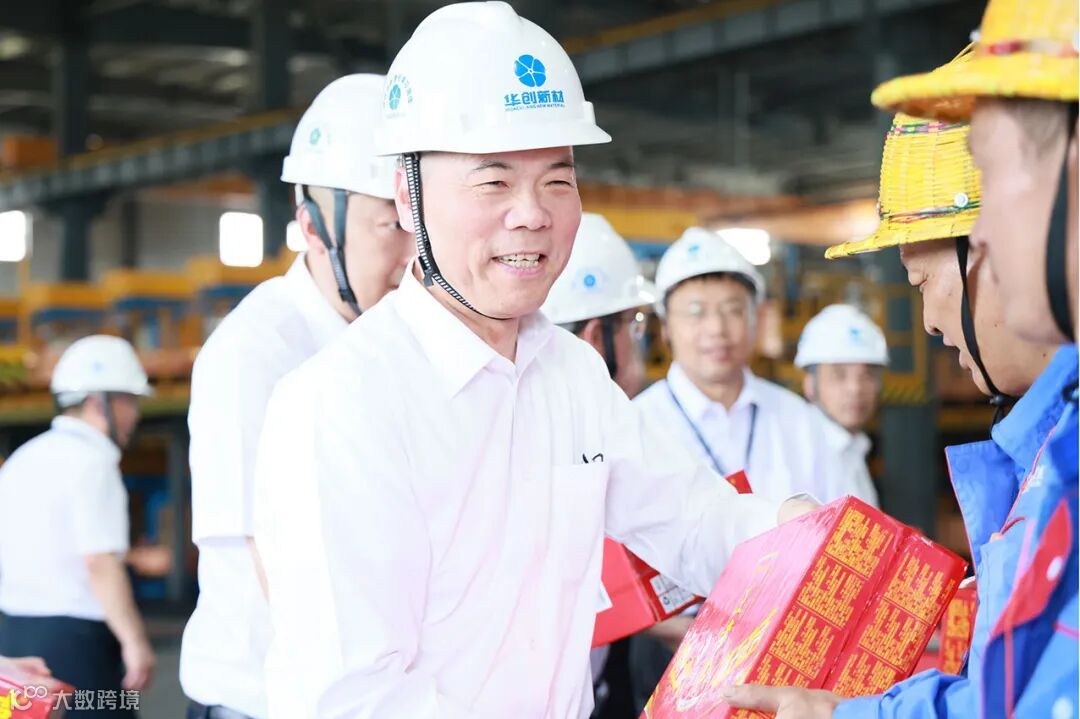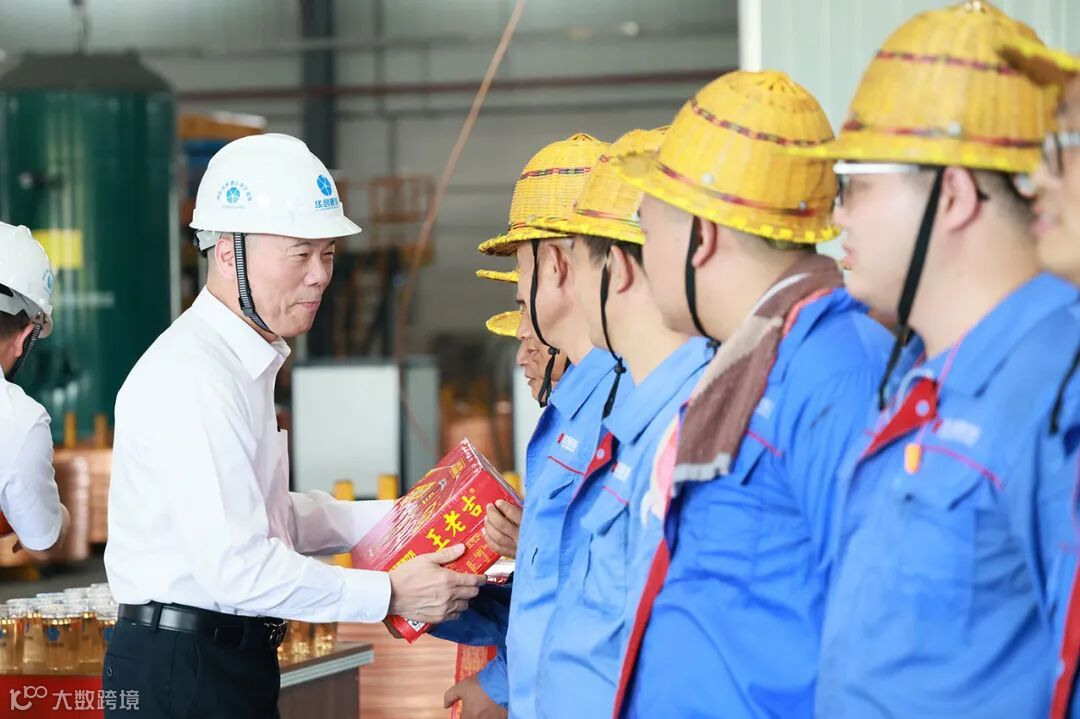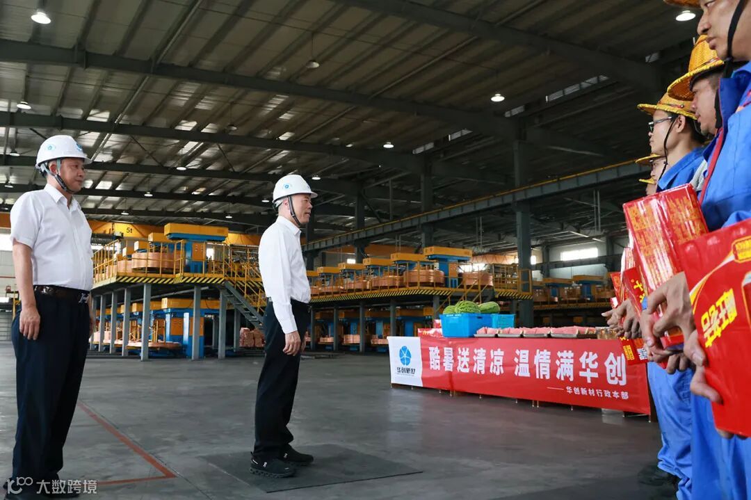正午时分,阳光炽烈,将路面晒得滚烫。在江西华创的拉丝生产车间,机器轰鸣,工人们熟练操作、紧张作业,热浪裹挟着奋斗的气息。华友控股集团董事长陈雪华在公司董事长兼总裁周盛夫和经营班子成员的陪同下,来到这里,为坚守岗位的职工们送来了清凉慰问,并带来了防暑降温的贴心物资。