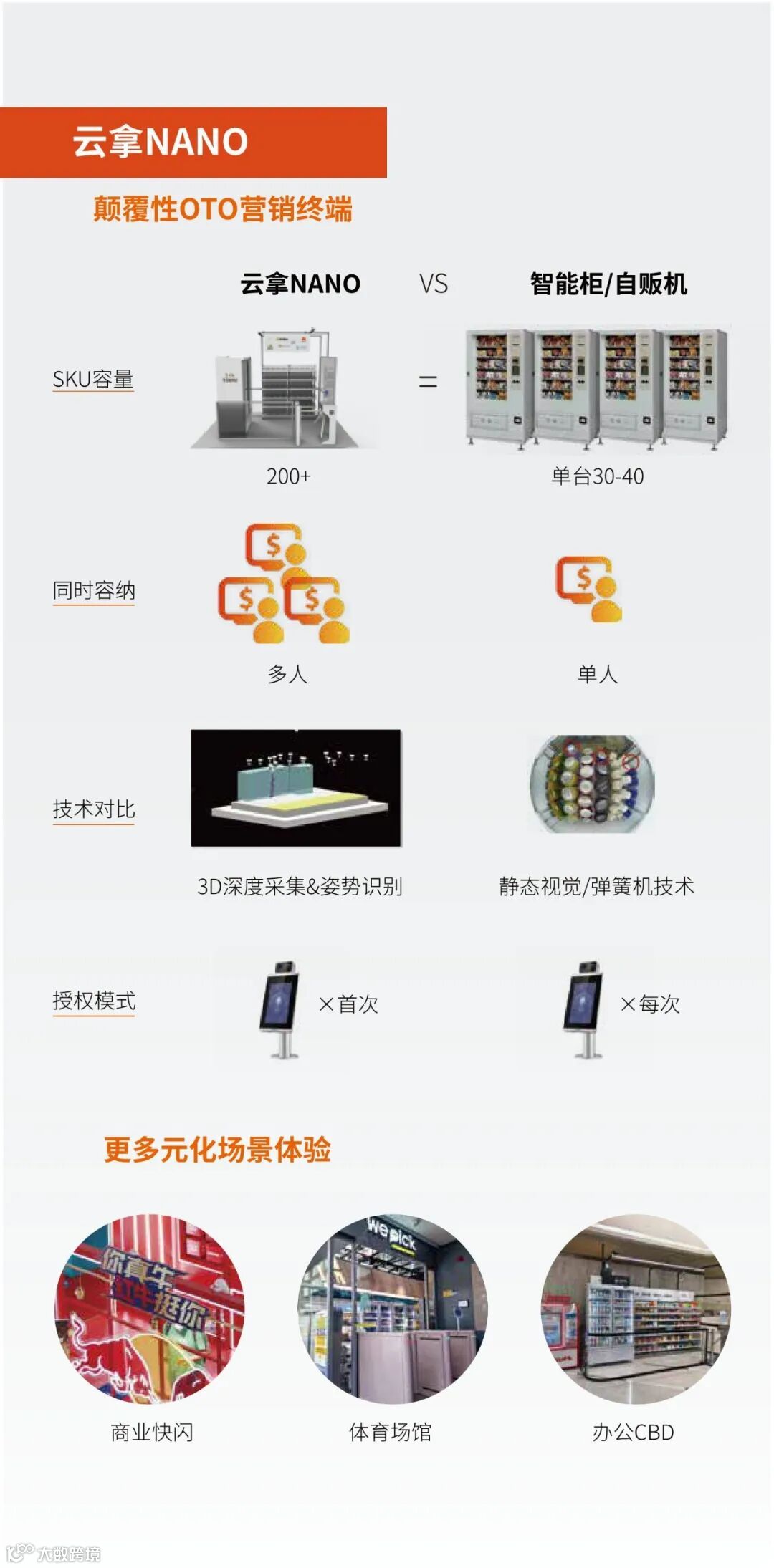 与传统的智能柜/自贩机相比,云拿NANO的SKU容量超过200个,能够同时容纳多人购物,极大地提升了购物效率和顾客体验。此外,NANO采用3D深度采集和姿势识别技术,相比传统的静态视觉和弹簧机技术,提供更精准的识别和更流畅的购物体验。
