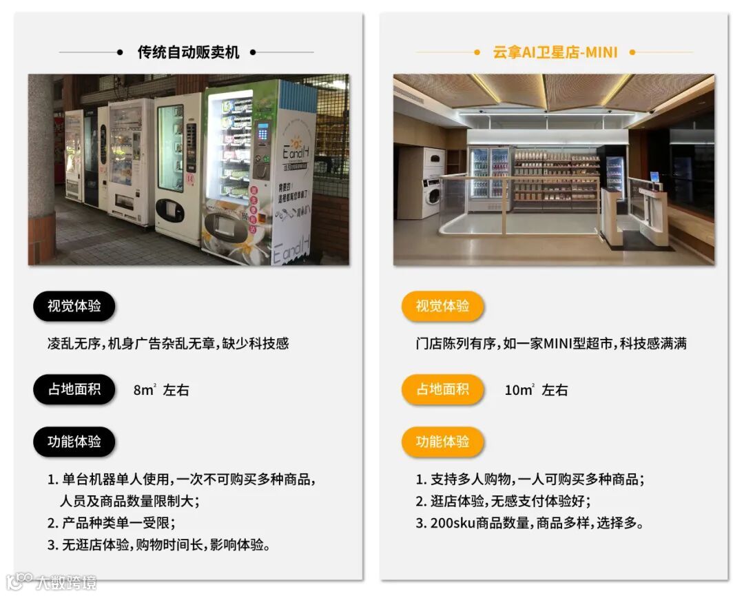 东禾九谷负责人透露前期在开店调研阶段,也对比了多家自动贩卖机多种柜体售卖形式以及有人精品店,在功能、技术、服务、成本等多维对比之下,云拿AI卫星店-MINI典型虽然只有10m²大小,但可实现多个“一对多”服务,多人进店购物、一人可同时购买多种商品等购物体验。而自动贩卖柜在这些购物体验上是空白,因此成功与云拿科技联手推出“东禾铺子”无人小店。