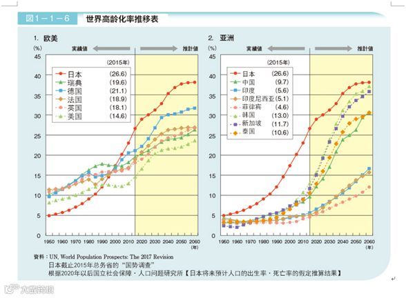 另据日本总务省不久前公布的人口估算数据显示,目前日本全国65岁以上老年人比上年增加32万人,达到3588万人,占总人口的比例升至27%。预计今后该比例还会上升,2025年可达30.0%,2040年达35.3%。
