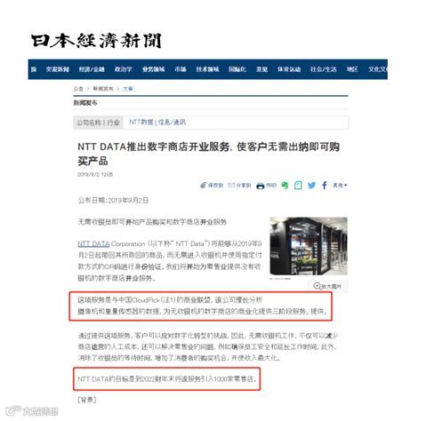 据《日本经济新闻》2019年9月3日报:8月,日本NTT数据集团在东京六本木推出计算机视觉型24h无人便利店。NTT规划在2022年底之前向日本的便利店,药妆店,超市等落地引进1000家采用云拿AI智慧零售方案的计算机视觉型无人零售店。