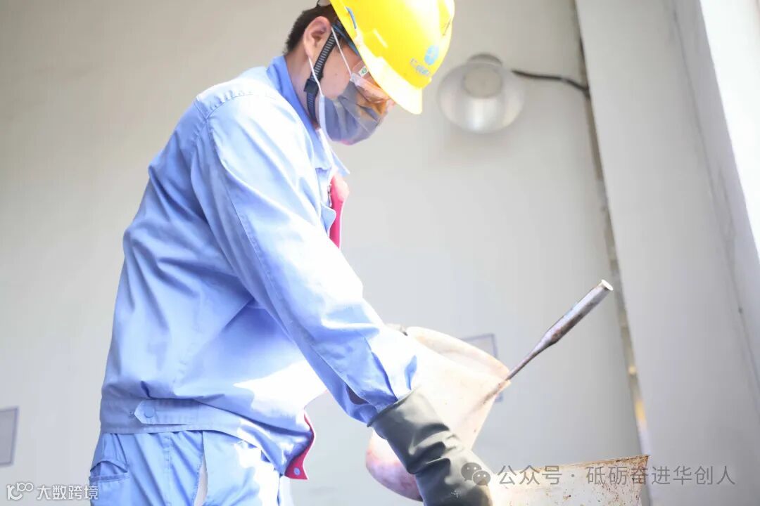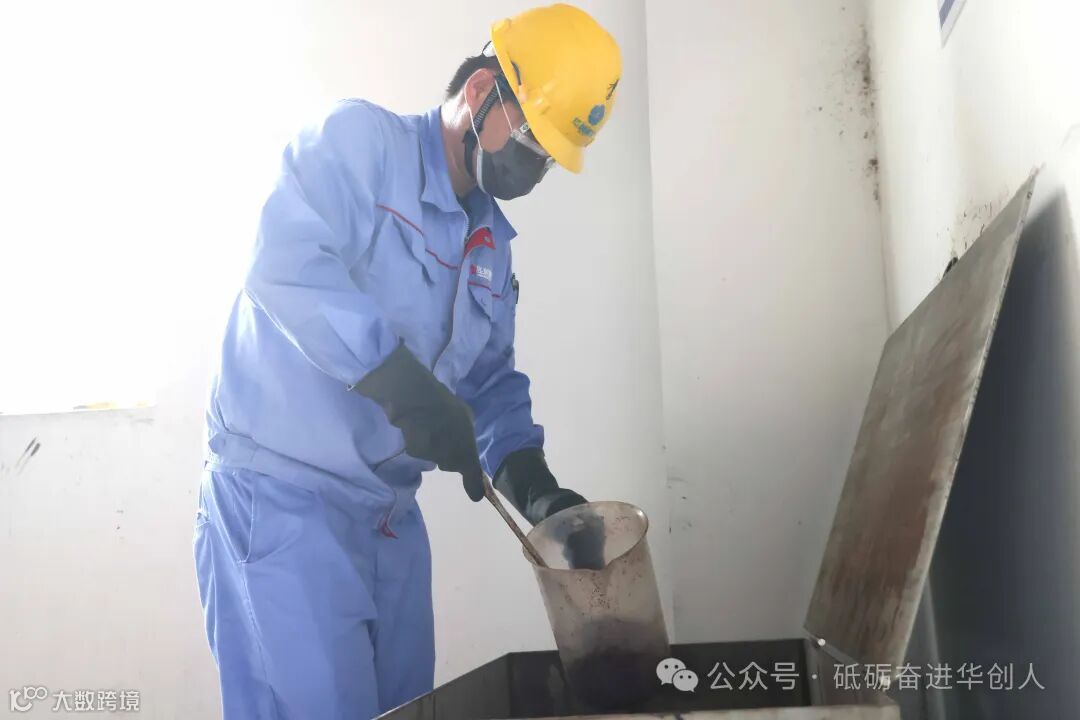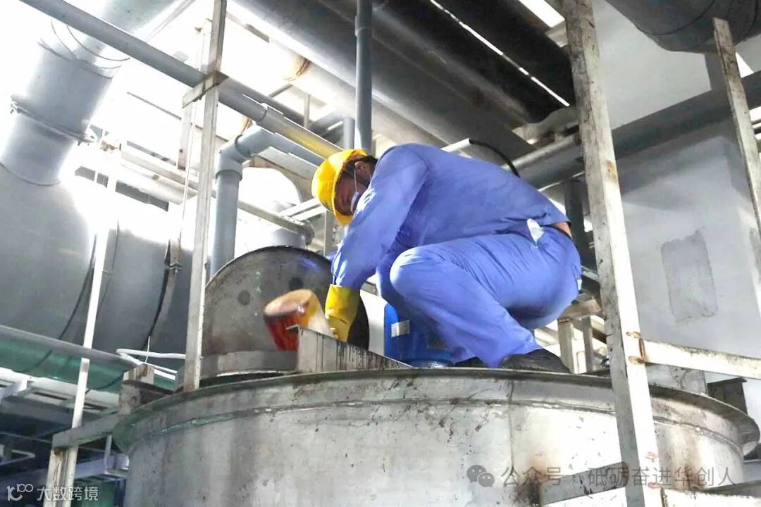 时节虽已入秋,但高温与设备的轰鸣声依旧充斥着江西华创生产一厂溶铜一车间,添加剂班长李道圣头戴安全帽,身着蓝色工装,脸上的灰色口罩和耳朵里的防噪软塞,让他“沉浸”在防氧化液添加的工作中。接水配药、爬梯加药、做好记录,一连串的动作看似简单,但反复数次后,汗珠不停地顺着脸颊流下,身上的工装早已汗湿。