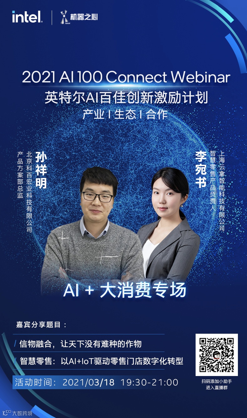 3 月 18 日晚 19:30 到 21:00,「2021 AI 100 Connect Webinar」首秀即将上线,届时科百科技产品方案部总监孙祥明、云拿科技智慧零售产品负责人李宛书将分别以「信物融合,让天下没有难种的作物」、「智慧零售:以 AI+IoT 驱动零售门店数字化转型 」为主题带来智慧农业和智慧零售行业的一手解读。