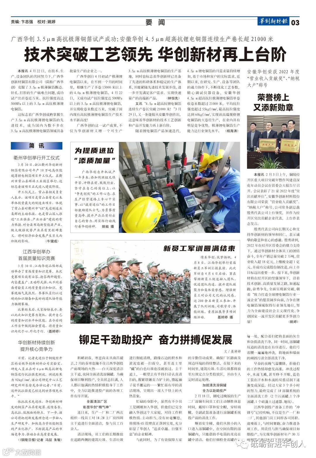 安徽华创新材料股份有限公司(简称华创新材)成立于2016年10月18日,目前在国内有多个生产基地,主要经营范围为电解铜箔得生产、销售及研发。我们致力打造全球电解铜箔行业一流企业。