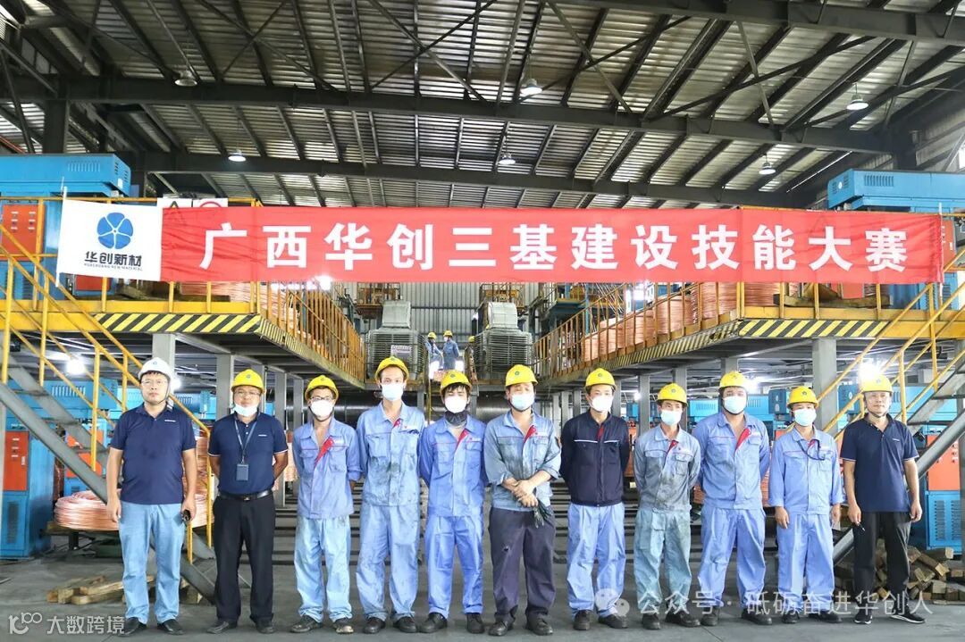 在广西华创西北角,是拉丝厂的竞赛场。现场15位选手分别参加了引杆和碰头焊接的项目赛。秋季的玉林延续着夏天的炎热,但他们似乎早已习惯了挥汗如雨的日常,冒着炎热在设备中穿梭,将一根根铜杆从冷却管里引出,并及时检查设备运行状态和铜杆质量。另一头,在拉丝机的前端是碰头焊接竞赛点,选手们快速剪切铜杆并细致打磨衔接端面,接着精准地将铜杆穿过焊接机,瞄准时机将两个端面精准焊接成型……