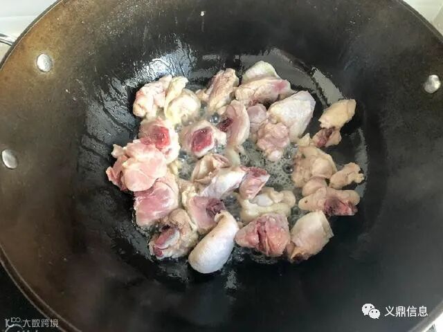 4.倒入锅中。油热后,把切好的鸡腿倒入锅中翻炒。