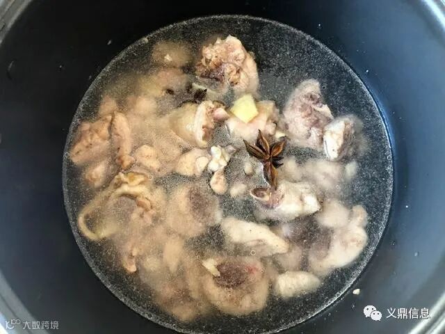 5.然后将炒好的鸡腿倒入电饭煲中,加入八角和姜片,加入适量的水,按通常的烹饪程序调整至保温。