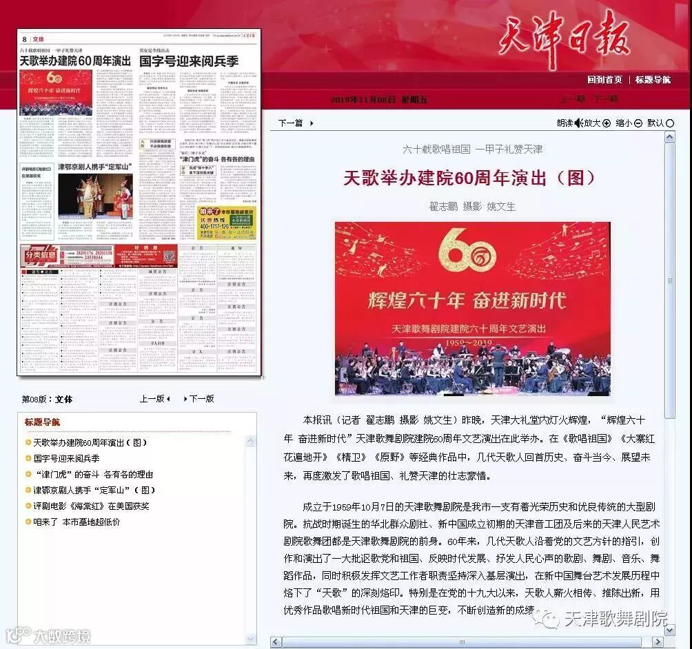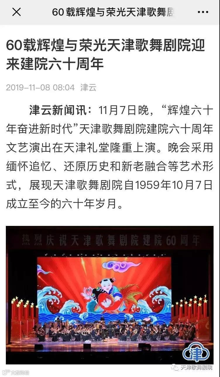 11月7日晚,天津大礼堂内灯火辉煌,“辉煌六十年 奋进新时代”天津歌舞剧院建院60周年文艺演出在此举办。在《没有共产党就没有新中国》《歌唱祖国》《在希望的田野上》《大寨红花遍地开》《连年有余》《精卫》《天鹅湖》《吉赛尔》《原野》《白毛女》《江姐》《茶花女》等经典作品中,几代天歌人回首历史、奋斗当今、展望未来,再度激发了歌唱祖国、礼赞天津的壮志豪情。