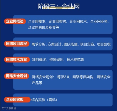 阶段攻克数据中心、园区网络、企业网络、运营商网络技术与应用,千万级实训室复现用户到国际出口的“河、湖、江、海”全网脉络。