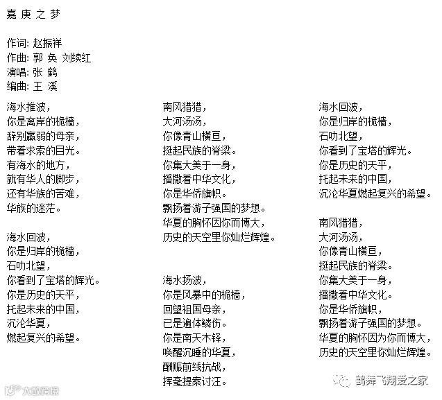 由张鹤演唱,词曲作家刘续红先生,词作者厦门华侨大学教授赵振祥老师共同创作的歌曲《嘉庚之梦》在厦门音乐台循环播放。为纪念爱国华侨陈嘉庚先生,特别写了这首歌以表达怀念之情。