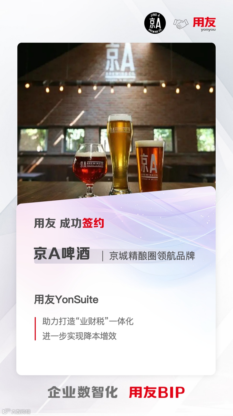 在数智化时代,企业数智化转型已成为推动企业持续增长和提升竞争力的关键。近日,京A啤酒与用友正式签约,将依托用友YonSuite驱动公司实现业财一体化等多方面的管理创新,开启数智化新篇章!