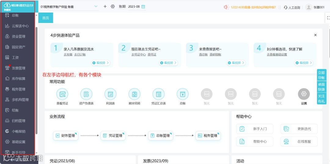从上图可以看到,在左边导航栏,我们可以看到财务软件好会计展示的模块分别是:总账模块、报表模块、资金管理模块、固定资产模块、工资模块、发票管理模块、库存核算模块、税务管理模块、多机构管理模块、结账模块、归档管理模块、小畅报销模块、基础设置模块、新手引导模块等。