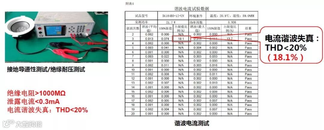 室内照明产品总谐波含量大,会导致中线电流大,严重会引起火灾。乐雷光电低谐波筒灯D1164产品功率21W(三次谐波18.1%)。谐波含量标准--国标:GB17625.1-2003规定,总输入功率≤25W的灯具三次谐波小于86%。