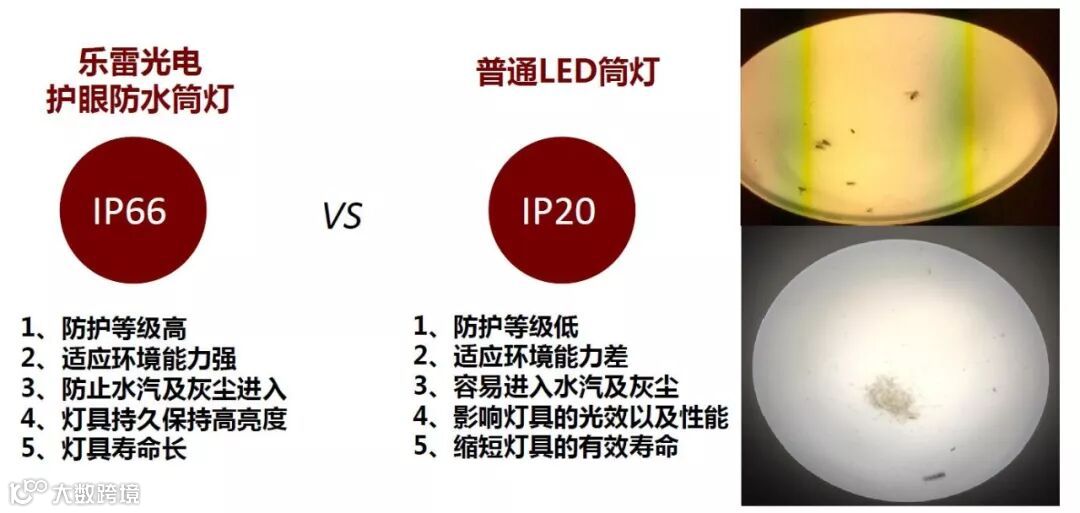 室内产品国标标准防护等级IP20,但是IP20灯具用上半年时间,产品里面就会有飞虫、蚊子等,而且容易进入水汽及灰尘,不仅影响光效,使用寿命也短。乐雷光电研发的护眼防水筒灯,防护等级IP66,防护等级高,适应环境能力强,防止水汽及灰尘进入,亮度持久,寿命长。