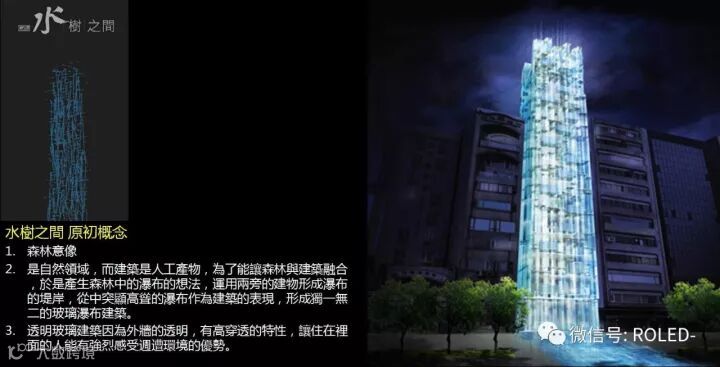 台北水樹之間是乐雷光电四合一(RGBW)经典案例之一,此建筑是世界第一座瀑布建筑,建筑物外观采用透明玻璃,让戶外的风景、气候、光线能夠自然地进入到室內,成为空间的一部分。居住者身处建筑物里,彷彿漂浮在森林上方。