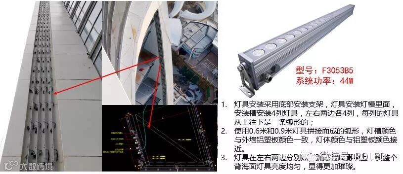 亚特兰蒂斯主体泛光采用乐雷光电大功率投光灯(F3053B5)、中功率投光灯(F3284S6)、小功率投光灯(F3275S)将建筑洗亮,突显建筑内在气质,层次感,满足功能性照明的同时,达到视觉美感。依据建筑功能灯具采用底部安装支架,安装灯槽内,灯槽颜色与外墙颜色一致,做到见光不见灯。