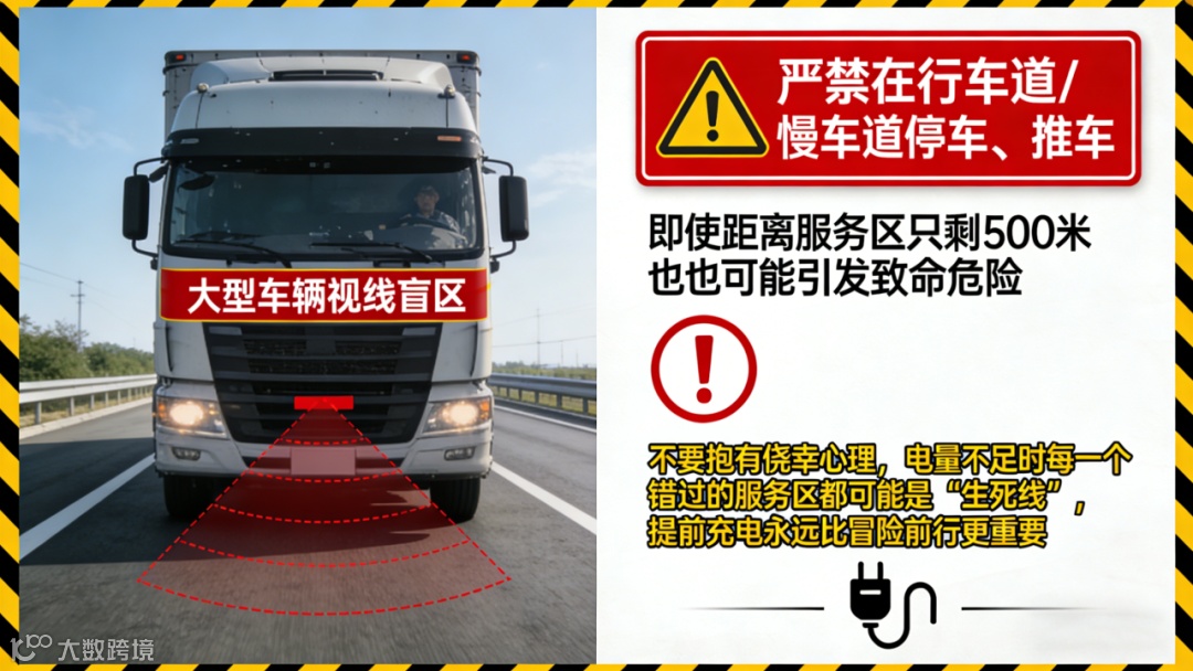 严禁在行车道/慢车道停车、推车!高速车流快,大货车视线盲区大,哪怕距离服务区只剩500米,也可能引发致命危险;