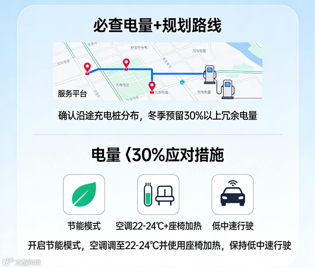 必查电量+规划路线,确认沿途服务区充电桩分布,冬季低温天建议预留30%以上冗余电量;