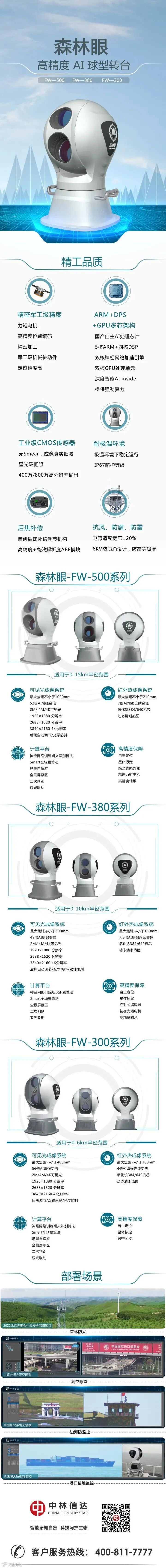 “森林眼”高精度AI 球型转台是一款可见光与红外系统结合的,针对大范围、远距离、全天时等特殊需求而定制研发的双光谱监控产品。产品采用抗风阻球型设计理念,按照军工产品的标准设计、生产,采用高精密传动系统可实现对目标的高精度定位、跟踪。产品具备抗强风、抗风沙性能,可在极其恶劣环境下长期稳定运行。同时内置智能烟火识别算法,可选配运动检测/跟踪算法,实现对火情、目标闯入等异常事件的自动预警功能。适用于森林防火、边海防、机场、交通枢纽、水利、旅游景区、保护区等远程监控场景。