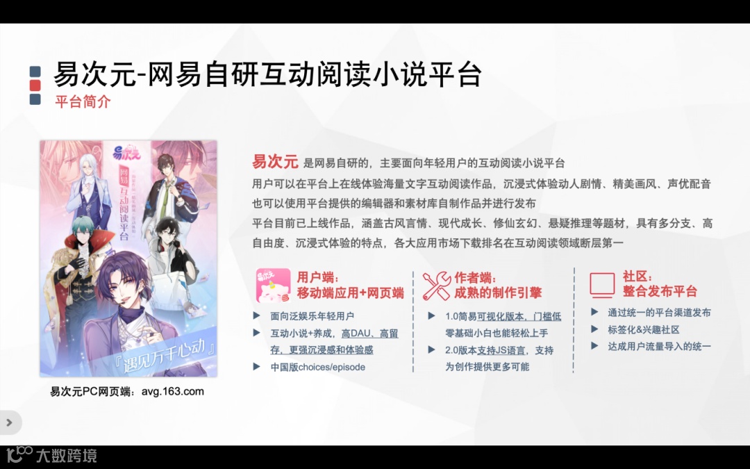 “易次元”是网易自研的、主要面向年轻用户的互动娱乐平台。用户可以在平台上在线体验海量文字互动阅读作品,沉浸式体验动人剧情、精美画风、声优配音,也可以使用平台提供的作品编辑器和素材库自制内容并进行发布;平台目前已上线《深宫曲》、《临帝阙》等畅销作品,涵盖悬疑推理、现代成长、古风言情等题材,具有多分支、高自由度、沉浸式体验等特点,各大应用市场下载排名均在文字互动游戏领域断层第一。