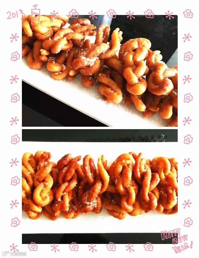 8、将麻花控油入盘后洒上白砂糖即可