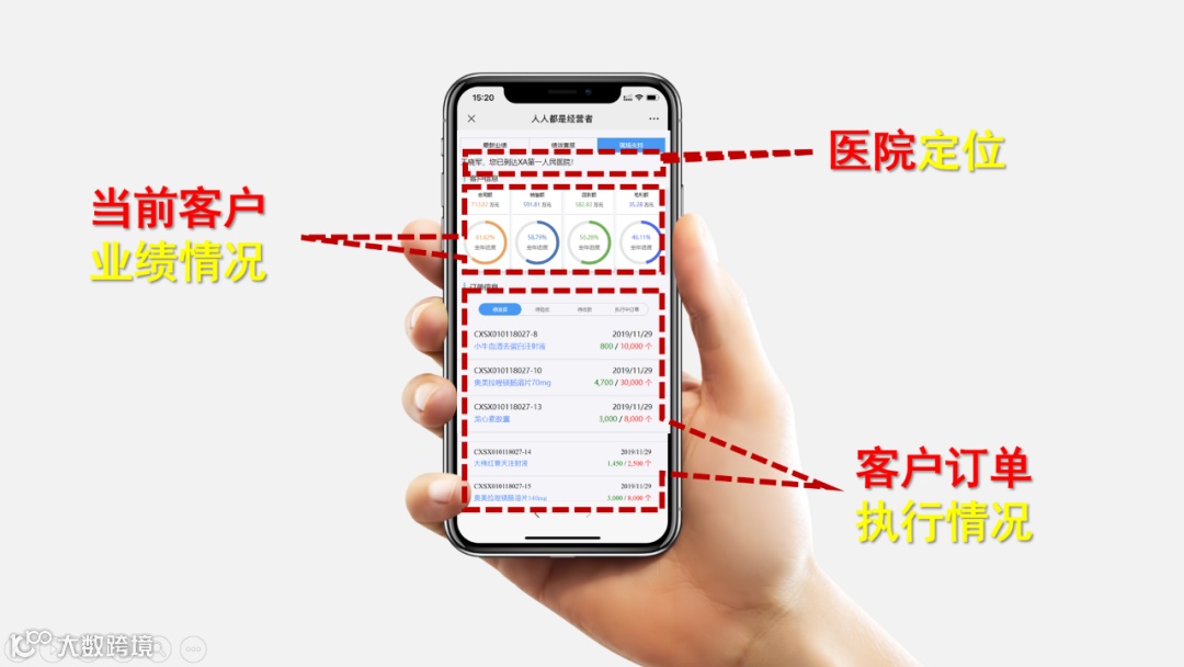 当医药代表来到了自己所负责的一家终端医院,习惯性定位打卡,通过数据应用服务看到该医院的订单状况、订单执行情况,协助高效推进订单的完成,更好地辅助员工完成业绩。