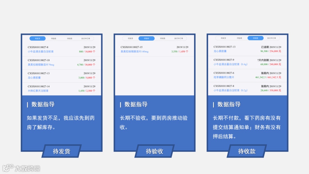 将订单数据按照流程进度情况进行划分:待发货、待验收、待付款、执行中。医药代表可以看到这些订单的进度情况,并根据数据采取相应的对策: