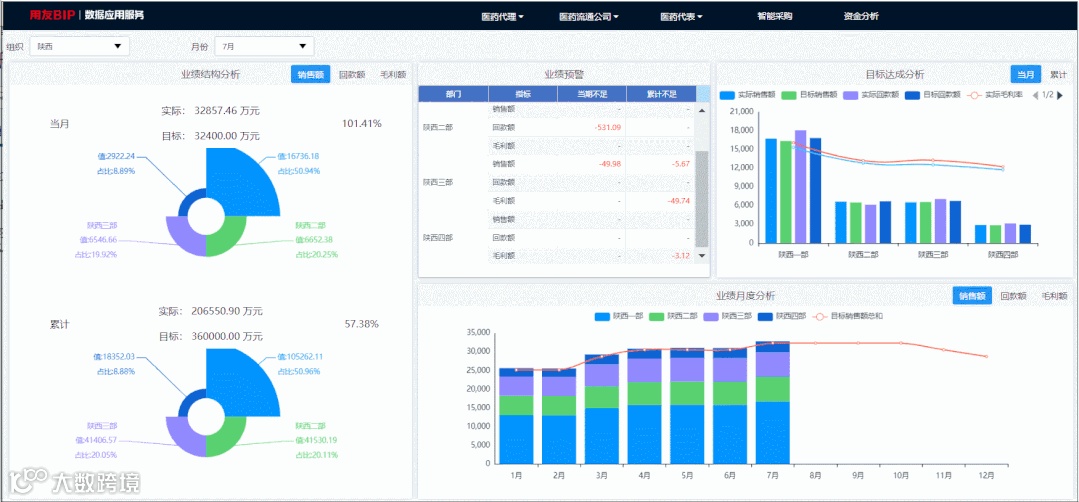 业绩预警分析:发现阻碍整体业绩提升的原因,具体出现在哪个区域、哪个部门、甚至哪位员工身上,并通过业务指导、激励等方式,保障部门乃至企业的目标达成。