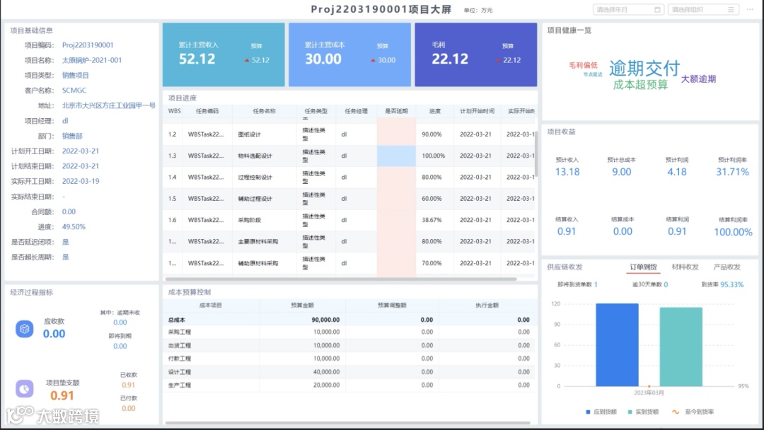 针对某一个项目,系统可以提供项目进度、项目收益、预算执行、客户收货等全过程跟踪与分析,有效实现事前预警、事中控制、事后分析。