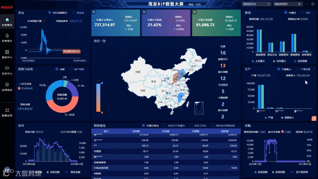 项目管理大屏为企业管理者提供了一个综合的项目视图,可以看到所有项目的分布及建设情况,还包括资金、应收、费用、销售、生产、库存、采购等关键指标,这使得管理层和团队成员可以一目了然地了解项目的整体状况,从而更好地做出决策和规划。