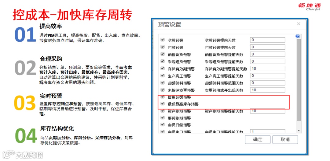 设置库存控制点和预警,按照最高库存、最低库存、临期等情况自动进行预警。及时干预,保证库存合理。
