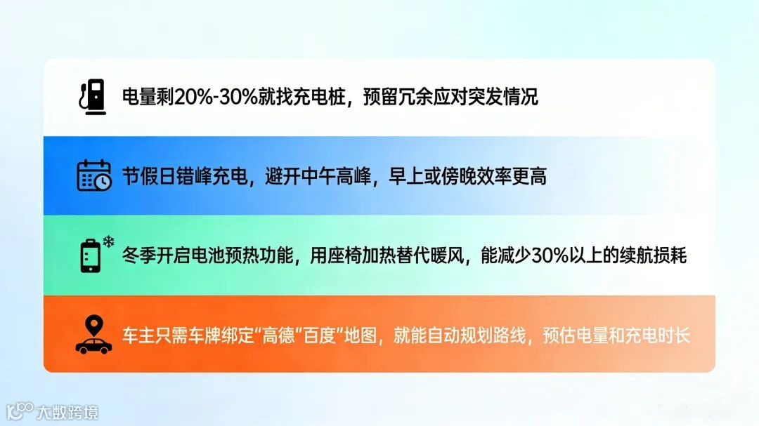 一是电量剩20%-30%就找充电桩,预留冗余应对突发情况;