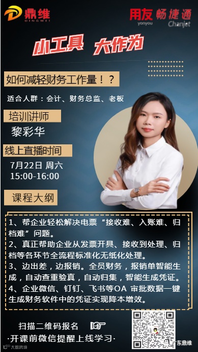 07月22日(周六)下午15:00 畅捷通顾问 黎彩华 老师给大家分享《如何减轻财务工作量》,感兴趣的朋友们,一起来学习吧!期待你的到来