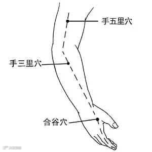 ①手握拳,从食指尖外侧沿着手臂外侧一直敲,敲到肩膀的位置,或只敲打【手五里→手三里】这一段。
