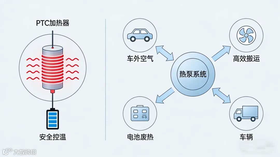 热泵系统:像个高效的 “热量搬运工”,不用自己烧电产热,而是靠一点点电,把车外空气、电池和电机工作时产生的废热 “搬” 进车厢里供暖,夏天还能反过来把车内热量 “搬” 出去制冷,能省不少电、减少续航损耗。