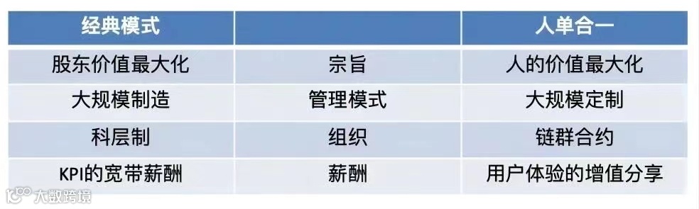 人单合一模式就是给所有人创造价值的机会,给所有人得到别人尊重的机会。如果你能完成这个项目就可以进来;如果下一个项目你完不成,就要出去。内部称为“动态合伙人”,不会论资排辈,而是“按单聚散”,谁有能力谁上。每个人都有无限的潜能,企业要创造一个环境,让每一个人的价值发挥到极致,所以人单合一模式的目的就是人的价值最大化,而传统管理的目的是企业利润最大化。人单合一模式也是让大家实现共同富裕。