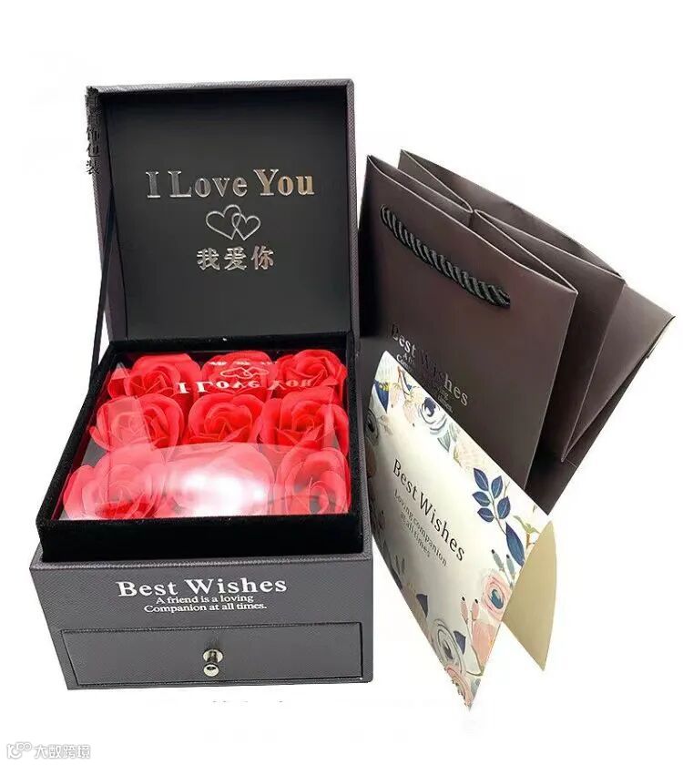 当然还有特别的礼盒装,最上面盒盖一打开有九朵玫瑰花,下面有单独的小抽屉放银手镯,满满的仪式感。