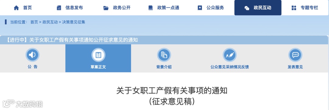 11月15日,天津市人社局在原产假有关文件的基础上,起草了《关于女职工产假有关事项的通知》(下称“《通知》”)及政策问答,现对外公开征求意见。