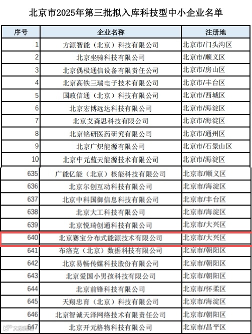 2025年10月27日,经过北京市科学技术委员会、中关村科技园区管理委员会的公示程序,北京赛宝分布式能源技术有限公司正式通过“北京市2025年第三批拟入库科技型中小企业”名单公示,成功获得科技型中小企业认定。
