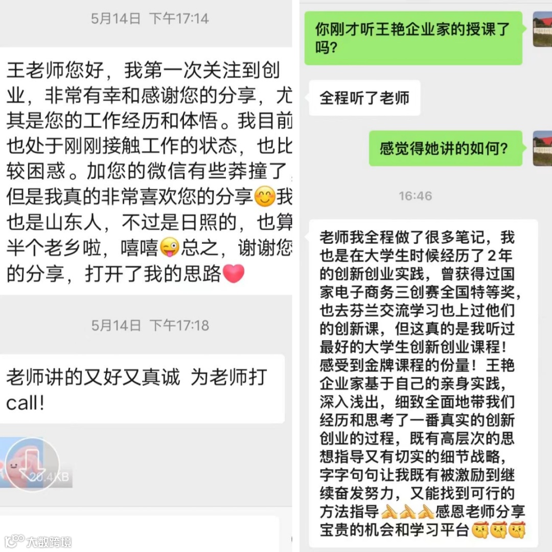 最后,王艳总经理对在座的同学们寄语:要善于学习,学习的最好课题是社会;如果创业一定要做充分准备并做自己擅长的行业;年青人做事业要学会借势会有事半功倍的效果;要学会感恩,懂得回报社会。此时授课时间已到,同学们还是意犹未尽,不愿散去。有的同学做了详细的课题笔记、有的同学课后还和王艳总经理互加微信继续交流、更有“蹭课”的悉尼工商学院硕士研究生刘心同学称赞这是她听过最生动的青年企业家线上面对面传授“创业经”,也点亮了自己的寻梦之灯。