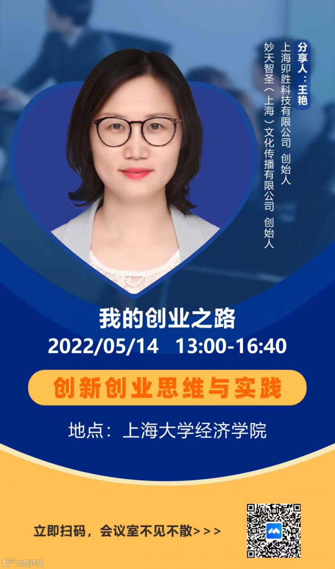 广鉴学院SMBA58期学员,上海卯胜科技有限公司创始人、青年企业家王艳总经理,2022年5月14日下午应上海大学经济学院(硕士生导师)兼职教授陈新光博士的邀请,走进《创新创业思维与实践》第八课讲堂,向上海大学2021届部分金融专业、国际商务专业硕士研究生分享了她的创新创业经历。