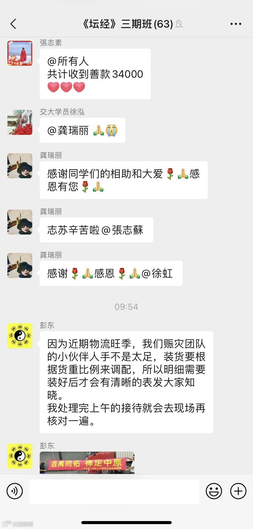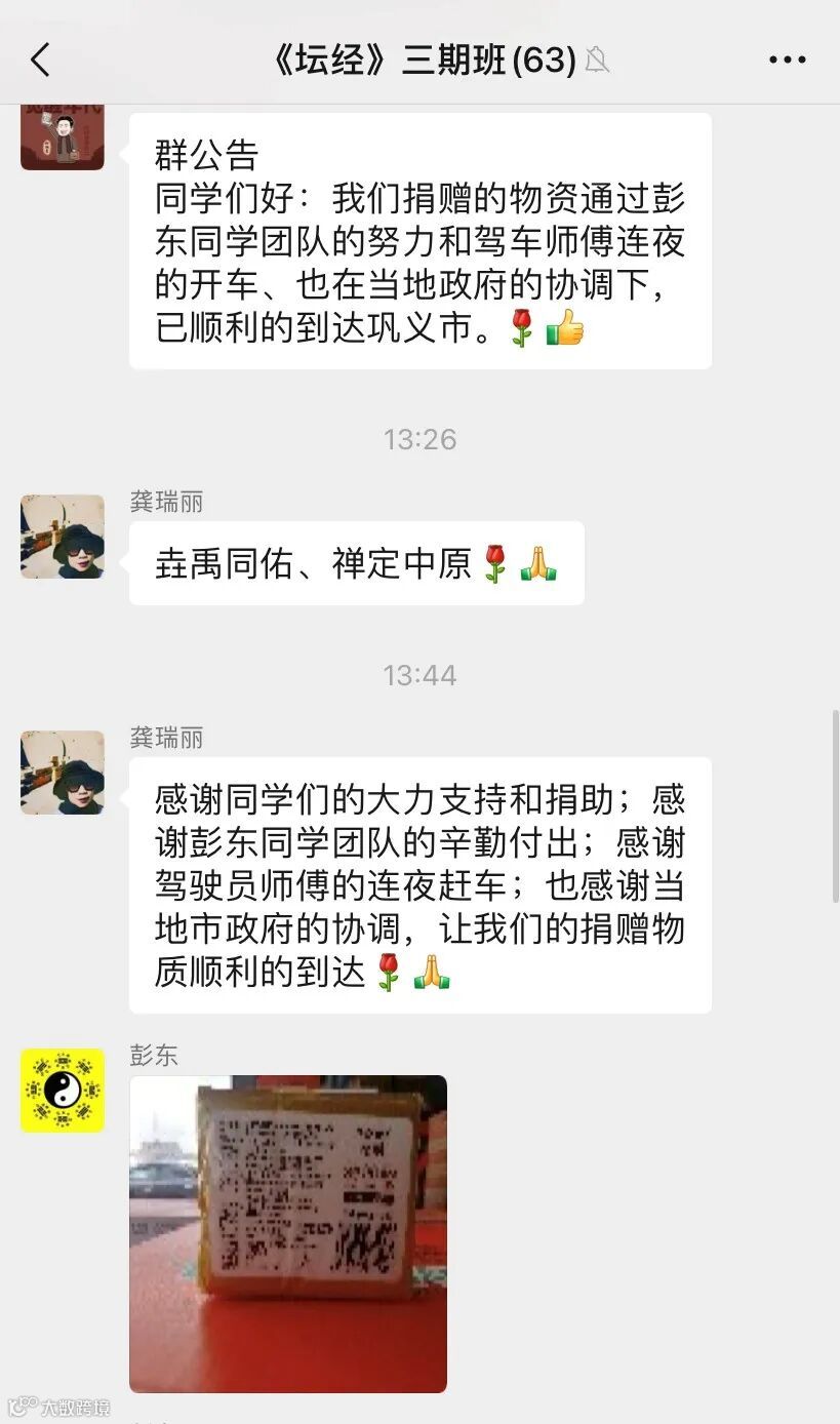龚瑞丽班长第一时间赞叹彭东同学的大爱,并鼓励同学们群策群力,迅速发起捐赠工作,由彭东同学及其团队采购物资、安排车辆运输物资以及对接巩义市政府工作人员接收物资,《坛经》三期班全体同学积极响应,奉献善款,广鉴学院率先捐赠6000元。